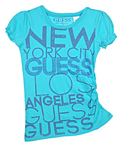 Give her the iconic look of Guess with this cute and stylish top! It features a round neck, ruffled cap sleeves, and ruching on the left seam. A studded logo sits atop a distressed "New York City/Los Angeles" graphic. Check out our complete selection of Guess bottoms to match! 100% Cotton Machine Wash Cold, Inside Out Made in China